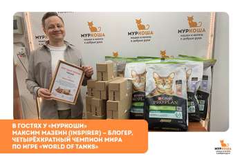 У нас в гостях побывал Максим Мазеин (Inspirer) — блогер, четырёхкратный чемпион мира по игре «World of Tanks»! Благодаря ему и его подписчикам, приют смог закупить корма на 220 000 рублей! Огромное спасибо за вашу доброту! Обнимаем пушистыми лапками и всегда рады видеть в гостях вновь!